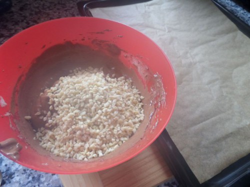 Z bílků vyšleháme sníh. Přidáme cukr a kakao. Nakonec vmícháme mandle. Lžičkou dáváme kopečky na pečící papír a pečeme 20 minut při 160°C.