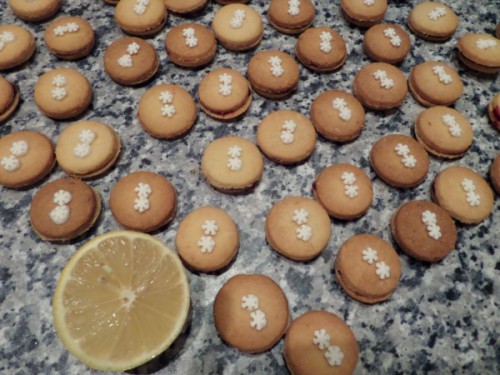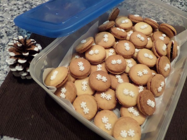 Z prosátého cukru, citronové šťávy a lžic horké vody utřeme hladkou lesklou polevu. Polevou přilepíme na kolečka cukrové ozdoby - v mém případě bílé vločky (může být barevné sypání, perličky..)
